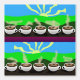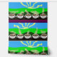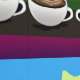 Koffieochtendpatroon met stoomkopjes romige koffie op een vensterbank met zonsopgang over een groen landschap.