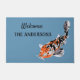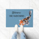 Voeg een naam toe aan deze welkome mat aan creëer een gepersonaliseerd cadeau voor huisverwarming dat perfect is voor iedereen die graag ontspannen is door hun koi-vijver. Voorziet een realistische stijlillustratie van een koivis of sierkarper in witte, oranje en zwarte letters tegen een lichtblauwe achtergrond met een naam in vetgedrukte zwarte letters.