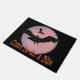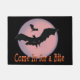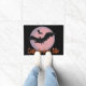 Kom binnen voor een Bite-deurmat met zwarte vampiervleermuizen die rondvliegen op een donkere nacht met een roze maan met lavendelring eromheen achter hen. Zwarte deurmat met oranje tekst die luidt: "Kom binnen voor een hapje." Creepy zeker, maar voegt een leuke en feestelijke flair voor Halloween.