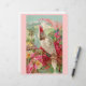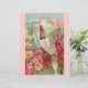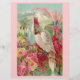 Dit is een Victoriaans afdruk van een mooie en kleurrijke scène met een cockatoe en heldere roze rozen. Op de achtergrond zijn er bergen en palmbomen. De papegaai heeft een roze roze krest.