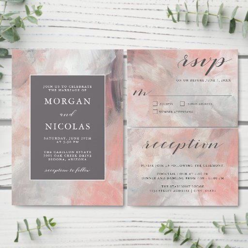 In prachtige schilderachtige stijl, kenmerkt deze moderne trouwdetails omhullingskaart abstracte borstelslagen in de oorrijke kleuren van woestijnstoffige koraal, verschillende tinten grijs en zandbeige. Het voegt een unieke artistieke indruk toe aan je trouwkantoor. De steekproefformulering op dit ontwerp omvat een tekst sjabloon voor het verstrekken van uw trouwgasten van details rond uw bruiloft. Typische informatie om te omvatten zijn speciale ontmoeten en groeten, hotelaccommodaties, groepstarieven, parkeren, richtingen of uw informatie van de trouwwebsite. Pas de tekst aan met de gewenste informatie. U kunt de tekst rond bewegen aangezien u door "verder"bij de bodem van de tekst sjabloon te kiezen wenst.