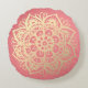 Een rondwerpkussen met een gouden toned mandala-bloem op een roze koraalachtergrond. Het is een prachtig cadeau voor iemand die van mandala kunst houdt, gouden toon en vrouwelijk decor.