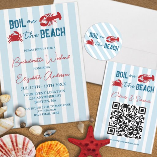 Kook op het strand! Kreeft- en visfeest juffrouwenweekend met een krab en kreeft tegen een kustblauwe gestreepte achtergrond
