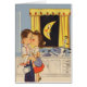 Cute retro kunstwerk dat een man en vrouw die zoenen tijdens het afmaken van de gerechten laat zien. De glimlende halve maan in het raam gezien.