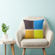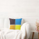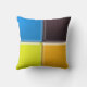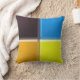 Vierkanten met een afgeschuinde 3D-uitstraling, in oranje, geel, blauw en zwart, komen samen in het midden van het kussen. De achterkant toont dezelfde kleuren in gewijzigde posities om de kleuren aan de voorkant aan de zijkanten te matchen.