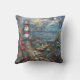 Kustvuurtoren Kussenhoes. © Radenbrea Studios op Zazzle. Een kussen met een kustscène met de oceaan, een vuurtoren, een dekstoel en een pad met bloemen erlangs.