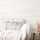 De achtergrond van de witte houtdrukachtergrond van de kust en de witte seizoenshellen werpen kussen met het woord "Relax"in dik wit manuscript.