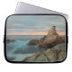 Een prachtige foto legt een ruige kustlijn bij zonsondergang vast. Het afbeelding beschikt over een grote, grillige rotsformatie die uit het water oprijst, met een kleiner gesteente op de voorgrond. De ondergaande zon werpt een warme gloed op de horizon, terwijl de hemel boven een mix is van zachte grijze en roze wolken. Het water is een levendige turquoise, met lange, vloeiende strepen gecreëerd door de beweging van de golven.