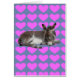 Kutje chocolade kleurige baby ezel die op een blauwe achtergrond met roze harten slaapt. De binnenkant van de kaart heeft twee roze harten. Kaart is leeg voor je eigen bericht.