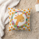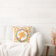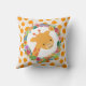 Een kussen met een afbeelding van een schattig glimlachend girafgezicht, omgeven door een grote hoeveelheid tropische waterverf bloemen. Kleurrijk en schattig. Achtergrond is een patroon met oranje spleetjes.