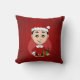 De jongen draagt een kussen met een afbeelding van een schattige lachende kaukasiaanse jongen met kort zwart haar, met een rood pet en een cadeau...