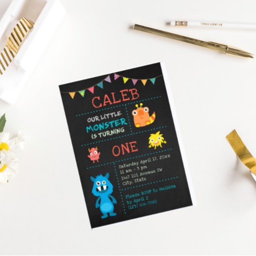 Een eerste themauitnodiging voor een verjaardagsmonster op een achtergrond van een bord. U kunt het leeftijdsnummer ook wijzigen. Dit is niet alleen voor de eerste verjaardag!