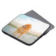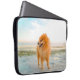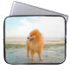 Laptophoes met een schattige oranje Pommeren/hond op het zandige strand met een mooie blauwe hemel.