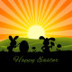 Zonnepaasafbeelding met 2 schattige cartoon konijnen die een paasei schilderen op een natuur achtergrond.