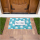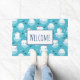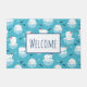 Een welkomstdeurmat met een schattig kerstpatroon met poolkussens die op drijvend beer staan en rode kerstmutsen dragen. Kleine iglo's, sneeuwvlokken en vissen omringen deze schattige polaire beren chilling op het water. Lichtblauwe achtergrond. Een witte rechthoek met een blauwe rand gelaagd over de top, met Welkom geschreven binnen. Schattige en grillig vakantieontwerp.
