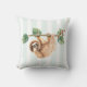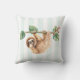 Een kussen met een schattige luiaard die ondersteboven aan een boomtak hangt. Boomtak is versierd met tropische bladeren en bessen. Zet op een lichtgroene en witte gestreepte achtergrond.