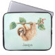 Laptophoes met een schattige slank die ondersteboven van een boomtak hangt. De boomtak is versierd met tropische bladeren en bessen. Reeks op een lichtgroene achtergrond.
