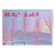 Een digitaal schilderij van besneeuwde berkenbomen; roze getint door de ondergaande zon. Inuktitut tekst lezen "Kuvianak Innovia" (ᑯᕕᐊᓇᒃ+ᐃᓄᕕ ᐊsigned - Merry Christmas), in het syllabische alfabet aangenomen in Nunavut, verschijnt ook in het rood. De Inuit worden gewoonlijk aangeduid als Eskimo, maar die term wordt nu benadeeld als het wordt beschouwd als pejoratief. Hier in het noorden is het gebruikelijk om besneeuwde bomen te zien die roze of oranje zijn gekleurd door de zon die laag aan de horizon hangt.