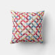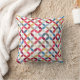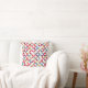 Een herhaald cirkelvormig kwartblad uitgesneden stijl patterend kussen in vettere winterwarmere kleuren rood, goud, blauwgroen blauw, grijs en wit van Sarah Trett. Ziet er geweldig uit in een slaapkamer of lounge.