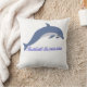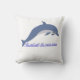 El elemento central es un delfín estilizado representado con un patrón que recuerda al arte, está saltando o nadando sobre un conjunto de olas vibrantes. Los colores predominantes son el azul turquesa, el azul marino oscuro y toques de blanco o un color de contraste, que destacan sobre el tela de otro color a crema, lino o blanco roto del cojín.