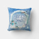 Schattigee kerst sneeuwpop met "Let it Snow" in blauw woord kunst omgeven door blauwe sneeuwvlokken. Er is een witte krans rond het ontwerp "Let it Snow". Het houden van de lachende sneeuwman gezelschap zijn zijn vrienden de blauwe vogel, baby blauwe vogel (beide zitten op de krans) en polaire beer. De achterkant van het kussen heeft dezelfde design. De achtergrond is zeer sprankelend met verschillende tinten lichtblauw.