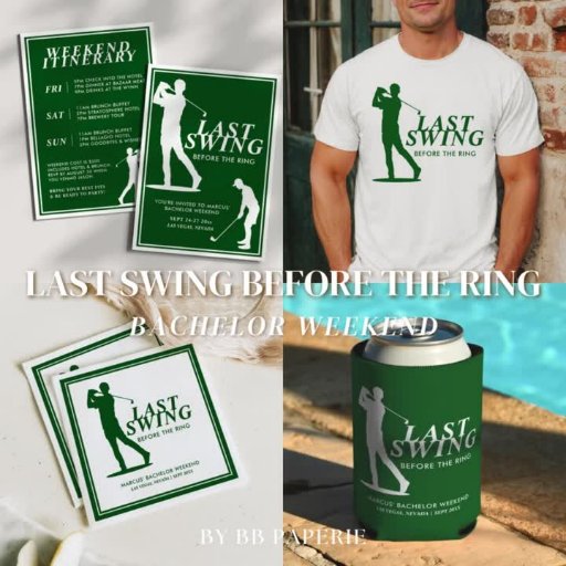 De Last Swing Before the Ring-suite is een verfijnde, golf geïnspireerde collectie voor een vrijgezellenweekend die preppy charme combineert met een vleugje speelse geest. Met een gewaagde golfer silhouet in diep groen en knalwit presenteert deze collectie het perfecte ontwerp voor een klassiek feest op de golfbaan. Met strakke lijnen, atletische flair en tijdloze typografie is deze suite gemaakt voor bruidegoms die liever trouwbeloften uitwisselen na één laatste ronde met de jongens.
