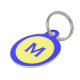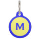 Helderkleurig label van de hond gedaan in blauw en geel, met een groot monogram van één letter, op de voorkant, en extra douanetekst, op de achterkant. Pas de tekst aan met de informatie van uw hond. Geweldig met onze coördinerende hondenbandana, de kraag en het uitlopen.