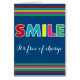 Kleurrijke glimlach, het is gratis tekstontwerp met strepen decoratie op blauwe achtergrond