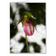 Een foto van een roze Lady's Slipper die in de schaduw van een boom is gegroeid.