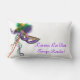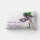 13 x 21-inch witte lumbale kussen met aan beide zijden een afbeelding van een prachtig paars, groen en gouden satijnmasker op een stok met coördinerende veren en linten, en de tekst "Laissez Les Bon Temps Rouler" (Let the Good Times Roll in French), in het paarse Franse schrift. Zie het hele collectie Mardi Gras Pillow in de DECOR | Afdeling Kussens.