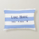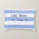 Klassiek Lake huis blauw en wit horizontale strepen kussen. Personaliseer familienaam en de coördinaten van het meerhuis. Trendy aanpasbaar lichtblauw en wit strepen kussen beschikt over uw meerhuis breedte en lengte. Zoek naar uw coördinaten op elke kaartensite en voer ze in het veld sjabloon in. Typografie is in retro belettering. Maakt een uniek op maat gemaakt housewarming cadeau voor nieuwe huiseigenaren en een perfecte aanvulling op uw huis aan het meer.