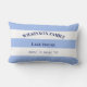 Klassiek Lake huis blauw en wit horizontale strepen kussen. Personaliseer familienaam en de coördinaten van het meerhuis. Trendy aanpasbaar lichtblauw en wit strepen kussen beschikt over uw meerhuis breedte en lengte. Zoek naar uw coördinaten op elke kaartensite en voer ze in het veld sjabloon in. Maakt een uniek op maat gemaakt housewarming cadeau voor nieuwe huiseigenaren en een perfecte aanvulling op uw huis aan het meer.