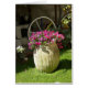 Een mooie landvaas vol paarse bloemen plaatst zich tegen een achterkant van een landwagon wiel. Deze kaart blijft leeg zodat u deze kunt aanpassen aan uw behoeften. Gebruik alleen of samen met onze bijbehorende stempel.
