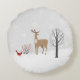 Een rustige ronde kussen toont een winterwonderland van antieke huizen rond de rand van het kussen. Tussen de huizen staan stoere kale bomen en struiken waar nog rode bessen aan zitten. Kleine blauwe vogels verzamelen zich om wat bessen te eten. Herten en vossen zijn uit het bos gekomen om ook iets te eten te vinden. Sneeuw dwarrelt over het landschap. De achterkant toont een trotse hertenbok die naast een boom en een struik met rode bessen staat. Een levendige rode kardinaal zit in de buurt. Sneeuwvlokken dwarrelen om hen heen.