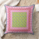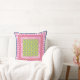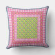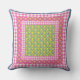 Een Sierkussen of kussen met een patroon van diepe roze, violette blauwe en gele primrozen op een bladgroene achtergrond, voorzien van een diepe roze en witte check gingham en een patroon van gele primroses en groene polka stippen op een diepe roze achtergrond; van het collectie "Primroses" uit Posh & Painterly.