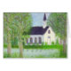 Pastel van een blanke kerk op een heuvel. Een vijver naast het weerspiegelt de onduidelijke beelden, de rode, de geelachtige, de sinaasappels en de puren van de gekleurde glazen ramen.
