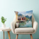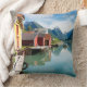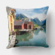 Foto gooit het kussen van het kussen met de kleurrijke huizen van het kleine dorp Fjaerland met reflectie in het water van de Fjaerlandsfjord, een tak van de Sognefjord, omgeven door grote bergen in Sogn og Fjordane, Noorwegen.