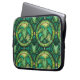 Laptop sleeve with a vibrant green botanical pattern featuring symmetrical fern leaves and circular motifs. Design conveys a fresh and lively tone.
