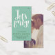 Het leuke, casual ticketontwerp voor een hert en doe of jack en jill party. Dit ontwerp bevat een script "Let's Party!" op een aqua achtergrond. Voldoende ruimte om te personaliseren met uw evenementgegevens en ruimte op achteruit voor de foto van het paar (of leeg laten). Andere beschikbare kleuren.