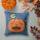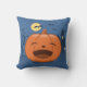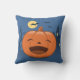Schattig lachen met Halloween pompoen. Een dode boom, een griezelige mansie, vleermuizen en de maan worden gezien op de achtergrond.