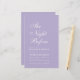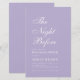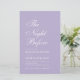Een eenvoudige, minimalistische lavendelrepetitie diner uitnodiging. Het heeft net witte tekst op lavendel (licht paarse) achtergrond. De titel "The Night Before" is geschreven in elegante kalligrafie, de gelegenheid "Repetisal Dinner" en de naam zijn geschreven in grotere petten, de rest in kleine petten. De tekst is links uitgelijnd.