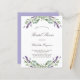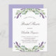 Een witte achtergrond versierd met lavendelbloemen en eucalyptusgroen. Personaliseer en een naam en details. Achterkant: lavendel, violette achtergrond. 1 vel = 1 uitnodiging afgedrukt rand tot rand.