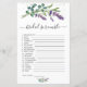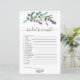 Word Scramble Vrijgezellenfeest spel. Dit ontwerp toont een waterverf van paarse lavendelbloemen en eucalyptus gebladerte. Bovenop de kaart - groenachtig effect confetti. De antwoordsleutel: huwelijksreis, taart, geloften, bruiloft, gangpad, boeket, huwelijk, bruidsmeisje, bloemen, voor altijd, bruidegom, receptie, champagne, man, liefde, familie, paar, ringen