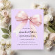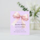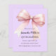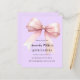 Een zachte lavendel, paarse achtergrond, versierd met een grote roze strik. Personaliseer en voeg een naam en partijgegevens toe. 1 vel = 1 uitnodiging bedrukt rand tot rand.