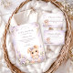 A sweet and whimsical baby shower design featuring an adorable bunny surrounded by soft lavender florals and delicate butterflies. The gentle watercolor palette of lilac, lavender, and soft greenery creates a dreamy nursery aesthetic with a light storybook feel. A tiny bow and tutu add an extra charming touch, making the design perfect for a soft, feminine celebration. Ideal for a lavender themed baby shower with a cute woodland-inspired atmosphere.