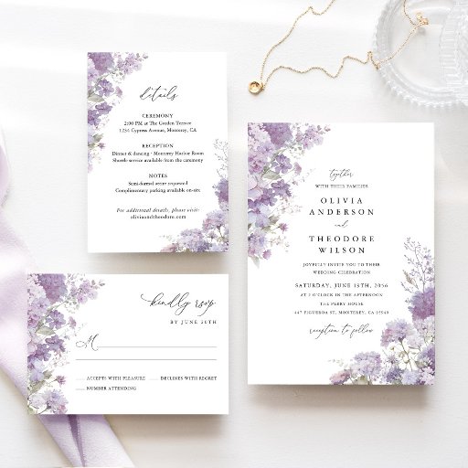 Complete the look with matching lavender wedding stationery including invitations, RSVP cards, details cards, table numbers, place cards, welcome signs, seating charts, and day-of wedding signage for a cohesive lavender wedding suite.