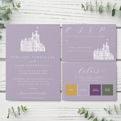 Lavender Vintage Castle Illustration Wedding Plaatskaartje