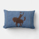 Robuust uitziende accentkussen in Lumbar-stijl is voorzien van een origineel digitaal schilderij van Leslie Sigal Javorek dat de look van bewerkt bruin leder met een cowboy vastlegt, zijn pet in de lucht gooit, bovenop zijn steigerpaard op een stenen denimachtergrond.