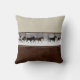 Heerlijk decoratoraccentkussen met een dunne lange foto van paarden die door de sneeuw rennen, zich uitstrekkend over het midden van het kussen. Afbeeldingen van een linnen uitziende achtergrond, op de bovenste helft van het kussen en een bruin antiek uitziende leder, op de onderste helft van het kussen. Aanpassen om tekst toe te voegen aan dit knappe kussen. Geweldig in elke kamer van het huis of de kantoor.