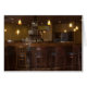 De binnenkant van een elegante staaf met een teak, staafjes, koplampen en een toren van vloeistof.